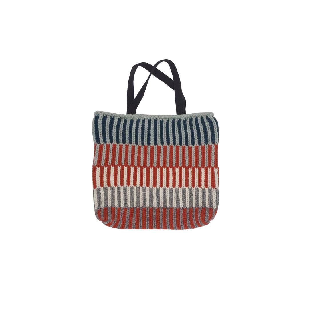 Hand bag with stripe pattern and zipper.