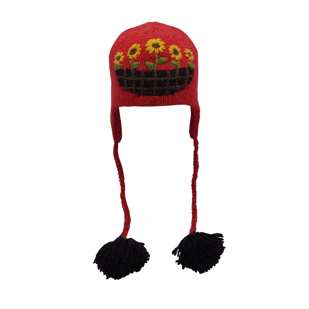 Earflap hat with Sunflower embroidery and Braided tassel.